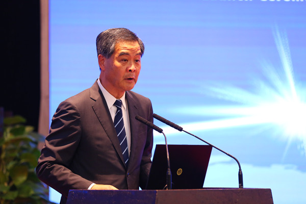 全國(guó)政協(xié)副主席、中國(guó)社會(huì)科學(xué)院“一帶一路”國(guó)際智庫專家委員會(huì)名譽(yù)主席梁振英致辭。本網(wǎng)記者 張哲 攝