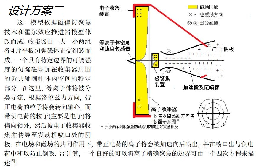 這一事實讓我想起了使用的離子推進器的衛(wèi)星, 如SMART和DAWN衛(wèi)星等. 離子推進器的廣泛應用說明了人類在短距離小空間內(nèi)加速離子的技術日臻成熟. 這也同時讓我考慮到一個新的模型——融合傳統(tǒng)離子推進器和沖壓發(fā)動機的設計, 讓等離子體代替空氣進入進氣道, 然后使用電場和磁場來加速, 以取代化學燃料的燃燒. 這就是我的想法的概述.