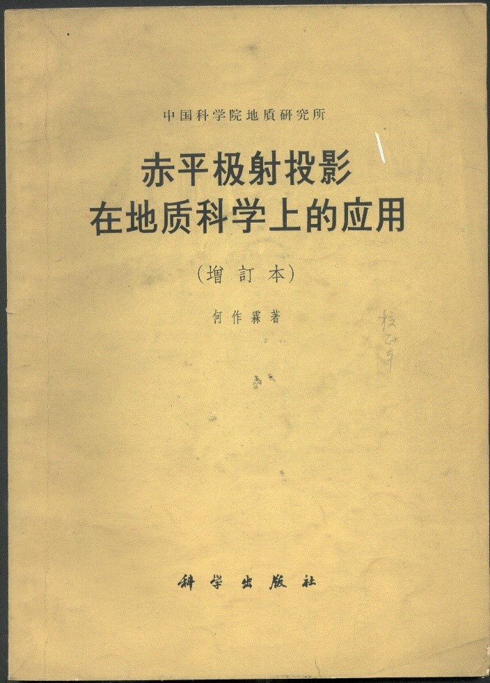 “極射赤平投影”不僅是研究巖組學的重要工具,而且也是地質(zhì)構造研究方面的方法典范,在地質(zhì)學上廣泛應用。何作霖是我國第一個對該方法在地質(zhì)科學上應用做綜合闡述者。他集多年的理論研究、科研實踐及各國零散資料撰寫出版了《赤平極射投影在地質(zhì)科學中的應用》(科學出版社,1958)一書,深受巖礦工作者喜歡,后又多次再版。這是世界上第一部這方面的專著,也是中國構造地質(zhì)學和巖石礦物學工作者長期必讀的重要工具書。