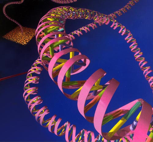 1953年4月25日,世界權(quán)威雜志《自然》雜志發(fā)表了沃森、克里克的一篇900多字優(yōu)美精煉的短文,宣告了DNA分子雙螺旋結(jié)構(gòu)模型的誕生。這個(gè)結(jié)構(gòu)模型的要義是:DNA是一個(gè)長(zhǎng)長(zhǎng)的雙鏈分子,由兩條同軸反向相互纏繞的多核苷酸鏈組成,外側(cè)是由脫氧核糖和磷酸根組成的分子骨架,中間是由互補(bǔ)的堿基對(duì)組成的階梯,堿基配對(duì)方式是A配T,C配G;堿基對(duì)間距為0.34納米,每10個(gè)堿基對(duì)形成一個(gè)螺旋周期,螺旋直徑為1納米。這個(gè)模型既能從螺旋性、分子直徑、堿基對(duì)的幾何學(xué)尺度等方面闡明X射線衍射圖像,又能以堿基專一性互補(bǔ)配對(duì)來解釋查伽夫當(dāng)量定律。DNA雙螺旋結(jié)構(gòu)是一個(gè)極為成功、無懈可擊的DNA分子結(jié)構(gòu)模型,它由兩條右旋但反向的鏈在同一個(gè)軸上盤而成,像一個(gè)螺旋形的梯子,生命的遺傳密碼就列在梯子橫檔上。據(jù)科學(xué)家統(tǒng)計(jì),一個(gè)體細(xì)胞的全部DNA“螺旋樓梯”長(zhǎng)約2米。若將一個(gè)人的全部DNA連接起來,可以在地球和太陽之間扯上80個(gè)來回。 DNA分子雙螺旋結(jié)構(gòu)模型的發(fā)現(xiàn),是生物學(xué)史上的一座里程碑; 1962年,沃森、克里克因發(fā)現(xiàn)DNA分子結(jié)構(gòu),與改進(jìn)了X射線衍射技術(shù)的威爾金斯一起獲得了諾貝爾醫(yī)學(xué)或生理學(xué)獎(jiǎng)。