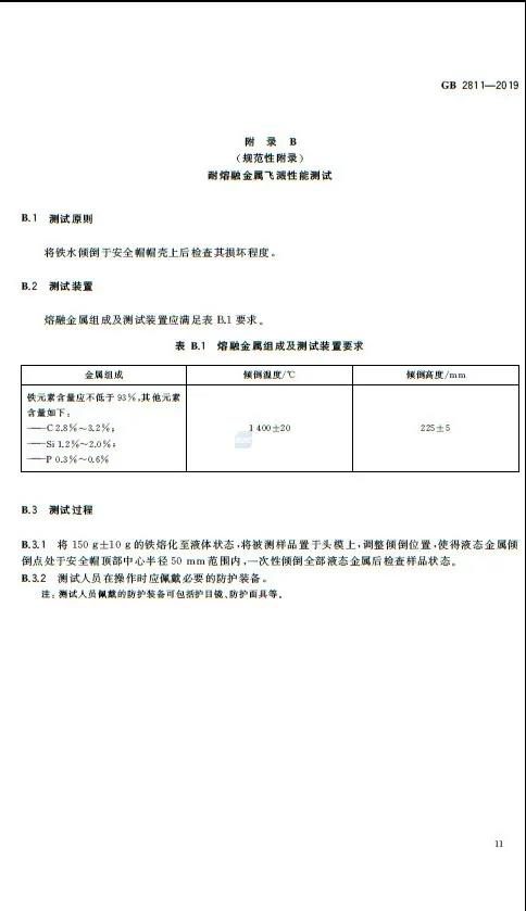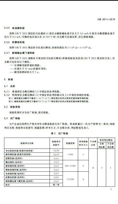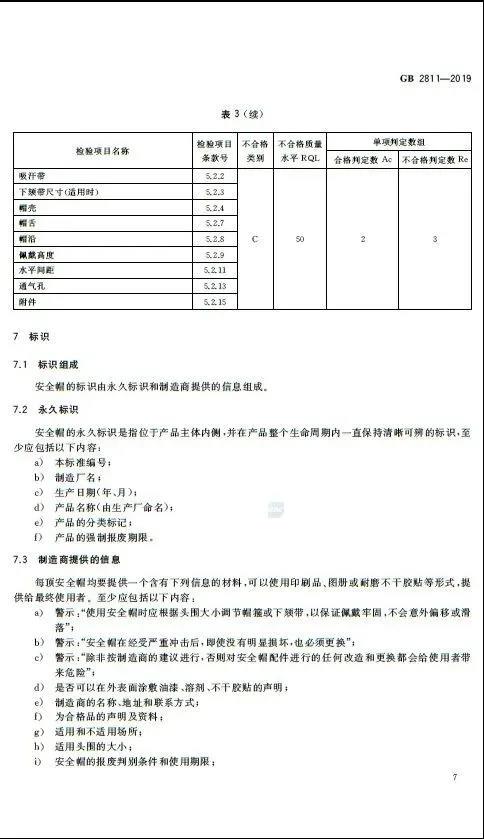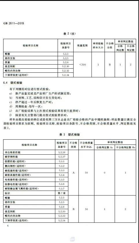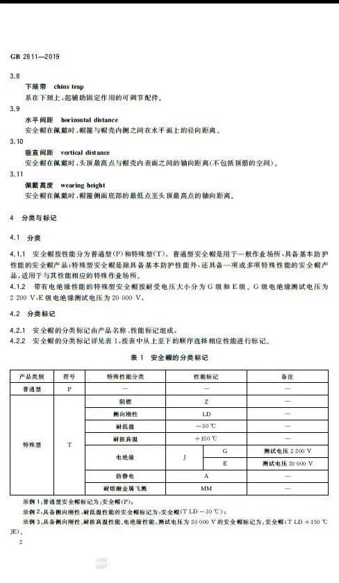 · 修改了標(biāo)準(zhǔn)適用范圍 · 修改了部分術(shù)語和定義的措辭,并刪除了部分術(shù)語 · 增加了安全帽的分類 · 修改了對于安全帽質(zhì)量的要求 · 修改了對于佩戴高度的要求 · 修改了對于通氣孔的要求 · 修改了對于耐低溫性能的要求 · 增加了對于耐極高溫性能的要求 · 修改了對于電絕緣性能的要求 · 修改了對于防靜電性能的要求 · 增加了對于耐熔融金屬飛濺性能的要求 · 修改了對于安全帽永久標(biāo)識的要求 新版的GB2811-2019規(guī)定,在安全帽內(nèi)側(cè),全生命周期內(nèi)必須清晰保持以下6項標(biāo)識: a)本標(biāo)準(zhǔn)編號; b)制造廠名; c)生產(chǎn)日期(年、月); d)產(chǎn)品名稱(由生產(chǎn)廠命名); e)產(chǎn)品的分類標(biāo)記; f)產(chǎn)品的強制報廢期限。 原文如下: