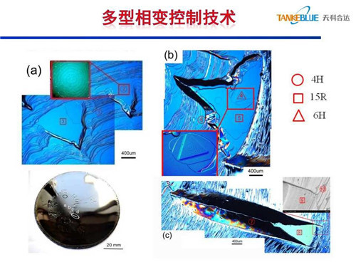 碳化硅晶體生長時如果臺階過寬,晶型沿 [0001] 方向的排列信息反應不出來,會在臺階上自發(fā)成核,發(fā)生晶型轉變。研究發(fā)現,當晶體表面不光滑、不平整時,易發(fā)生多型相變,4H會發(fā)生6H和15R相變。另一方面晶型轉變與生長室氣氛相關,通過控制生長室氣氛解決了多型相變技術。