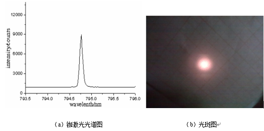 電子所是在國內(nèi)率先開展DPAL研究工作的單位之一,2012年5月,電子所實現(xiàn)了半導體泵浦線偏振基模銣激光輸出,經(jīng)繼續(xù)對實驗進行改進,獲得了最高2.8W的銣激光輸出,光光轉(zhuǎn)換效率達21%。實驗光路如圖2-7所示,實驗測量的銣激光光譜以及光斑如圖2-8所示。
