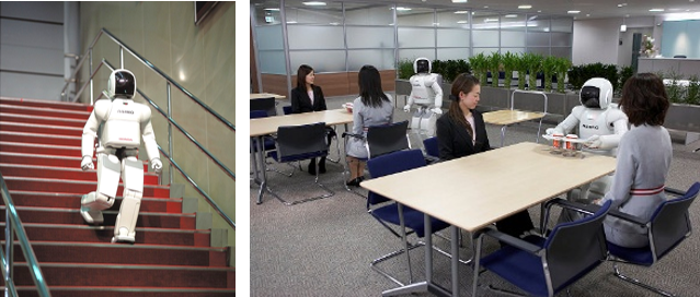 種服務(wù)機(jī)器人很多,比較有代表性的是日本的新一代仿真機(jī)器人,看看它現(xiàn)在都能干什么。這個(gè)機(jī)器人上邊是有眼睛的,還有各種各樣的傳感器。它現(xiàn)在已經(jīng)可以跑得很快,每小時(shí)跑九公里。它可以聽(tīng)得懂三個(gè)人同時(shí)發(fā)的命令,能簡(jiǎn)單對(duì)話。這個(gè)手已經(jīng)很靈巧了,能擰杯子。它可以主動(dòng)繞開(kāi)對(duì)面走過(guò)來(lái)的人,有的時(shí)候靠視覺(jué),有的時(shí)候靠身上其他東西。能踢球,做手語(yǔ)。我們希望這樣的機(jī)器人能早點(diǎn)進(jìn)入我們的生活,但是有兩個(gè)問(wèn)題沒(méi)解決,一個(gè)是電源,充滿電只能工作半個(gè)小時(shí),再一個(gè),智能還差的很多。