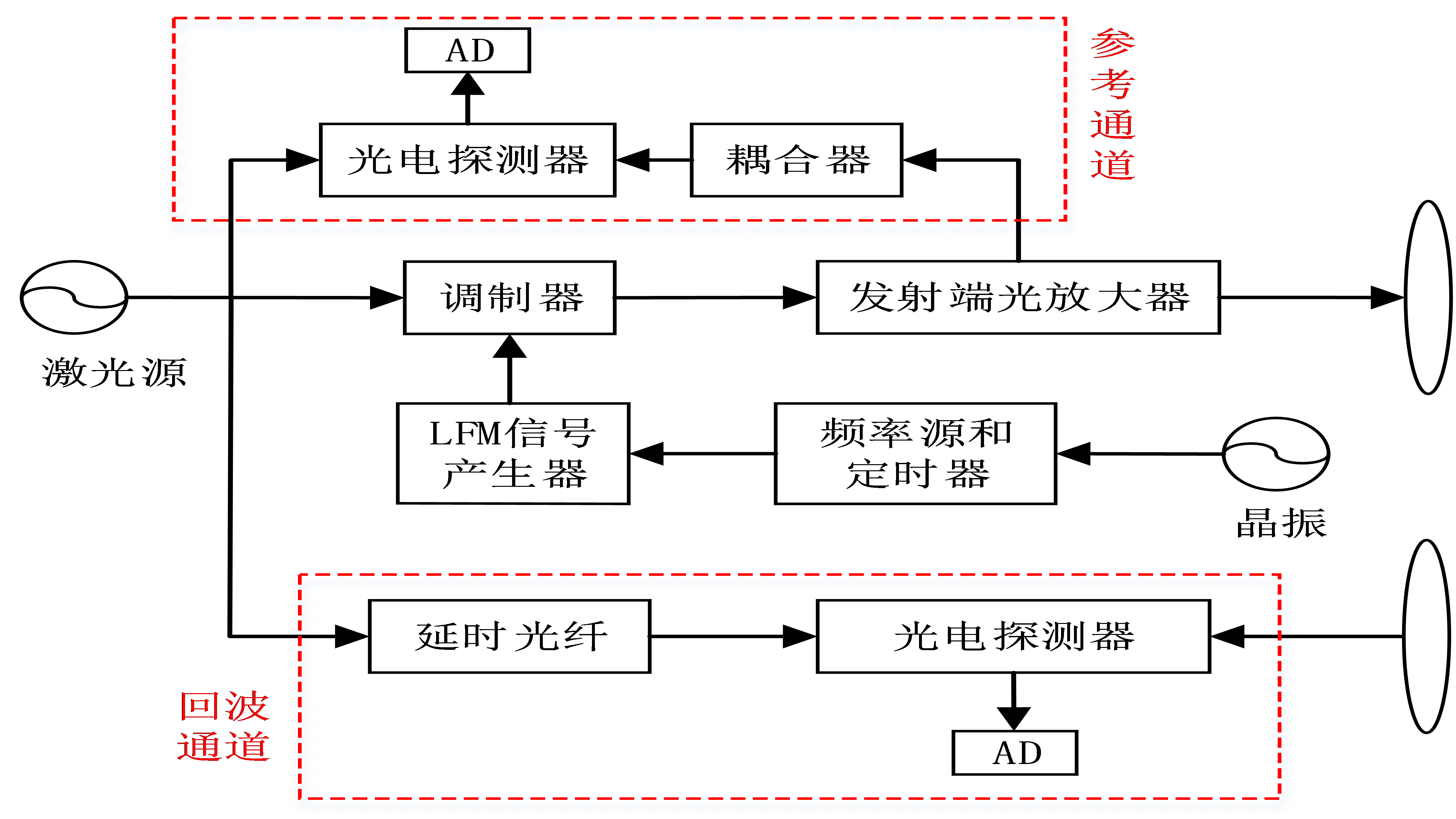 設(shè)置發(fā)射信號參考通道對其非線性失真相位實施定標(biāo)校正,以及通過本振延時光纖實現(xiàn)信號相干性保持方法如圖2所示。