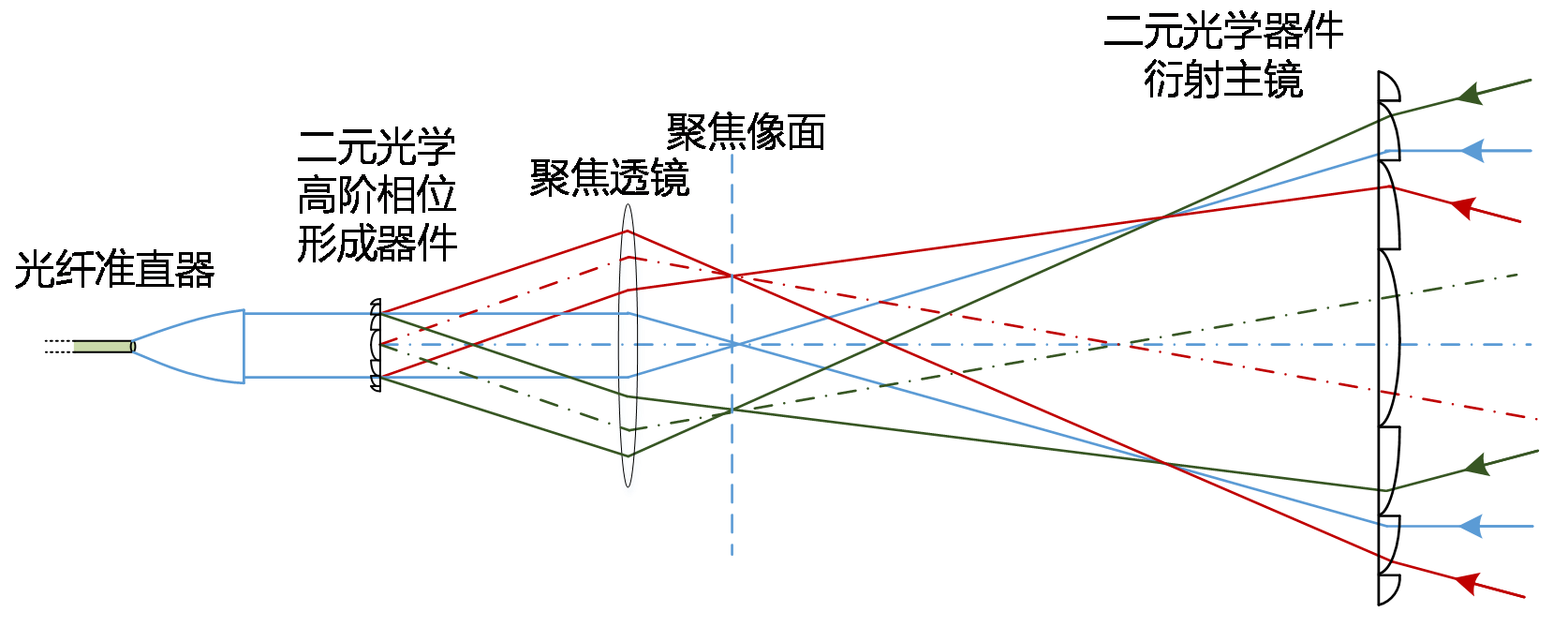 一個在壓縮光路中饋源和主鏡兩處使用二元光學(xué)器件的機(jī)載SAL衍射光學(xué)系統(tǒng)如圖4所示。