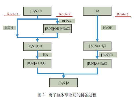 離子液體萃取劑的制備過(guò)程如圖2所示,包括將季錢鹽[R4N ]C1制備成季錢堿[R4N ]OH,然后與有機(jī)酸HA反應(yīng)生成[R4N]A。或者將有機(jī)酸HA與堿反應(yīng)生成A一Na,然后與[R4N ]C1反應(yīng)生成[RQN]A。前一個(gè)制備過(guò)程,尤其是利用KOH更加簡(jiǎn)單、低成本,產(chǎn)品的純度高。此外,離子液體萃取劑制備過(guò)程簡(jiǎn)單,反應(yīng)時(shí)間短,條件溫和,產(chǎn)品收率高,適合大規(guī)模的生產(chǎn)。申請(qǐng)者利用工業(yè)原料N263 ( Aliquat336的國(guó)產(chǎn)化的商品)與P507制備的[A336][P507]價(jià)格僅為170元/千克左右。另外,離子液體萃取劑性質(zhì)穩(wěn)定,經(jīng)過(guò)多次循環(huán)仍保持其萃取性能。此外,其水溶性較低,溶解度一般小于50ppm。這些都符合大規(guī)模工業(yè)應(yīng)用的潛在條件。