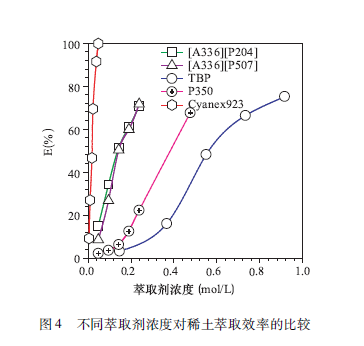 相同條件下在硝酸體系中萃取能力順序比較:TBP(磷酸三丁醋)< P350(甲基磷酸二甲庚醋)< [A336] [P507] < Cyanex923(圖4)。盡管Cyanex923是萃取稀土的優(yōu)良萃取劑,但成本比較高,且難以國(guó)產(chǎn)化,實(shí)際應(yīng)用中還是受到一定的影響。[A336 ] [ P507」的優(yōu)勢(shì)還體現(xiàn)在酸堿消耗低,反萃取完全。