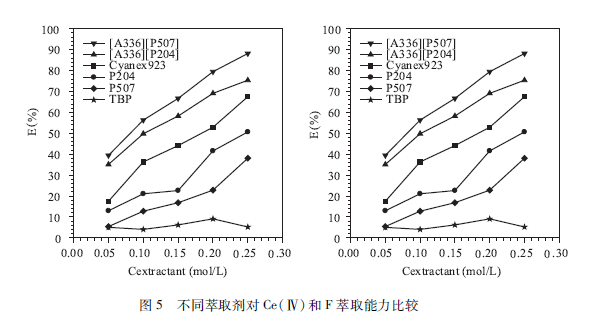 離子液體萃取劑應(yīng)用于H2SO4、體系中萃取鈰( IV)和氟,鈰( IV)與氟以CeF3+絡(luò)合,形成CeF ( HSO4 ) ( SO4 )2· [ A336 ] [P507 ]萃合物。分離鈰( IV),牡和稀土的順序:鈰( IV)>牡(W)>稀土(III ) o萃取劑的萃取能力比較順序:[A336 ] [ P507>Cyanex923 > TBP。對(duì)氟的萃取能力有相似的趨勢(shì),其結(jié)果見(jiàn)圖5。我國(guó)輕稀土礦含有近50%的缽,將缽(W)與稀土(111)分離,可以大大減少稀土萃取分離的壓槽量,縮短分離流程,降低成本。