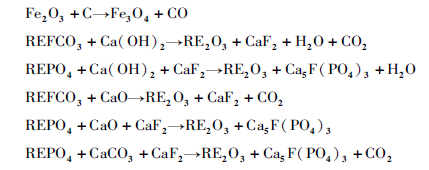 弱磁鐵礦一步法磁化與稀土礦物分解過(guò)程的反應(yīng)如下: