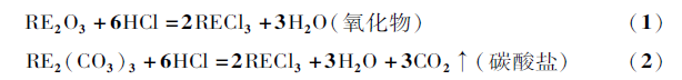 溶礦過(guò)程是以鹽酸溶解稀土碳酸鹽或氧化物,制備萃取分離料液,稀土濃度1-1. 7mo1/L,過(guò)程中每噸REO主要消耗2. 1-2. 5噸鹽酸,2-5噸水。