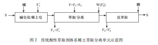 傳統(tǒng)酸性萃取劑體系稀土萃取分離流程,每一個(gè)分離單元的工藝如圖2所示,萃取劑有機(jī)相S需要用堿皂化,萃取難萃稀土A制取負(fù)載難萃稀土有機(jī)相,進(jìn)人分離段交換萃取分離對(duì)象(A和B)中的易萃稀土B以獲得純稀土A水相,隨后用純易萃稀土B洗滌萃取劑有機(jī)相中的難萃稀土A以獲得負(fù)載純易萃稀土B的有機(jī)相,最后用酸反萃取使B轉(zhuǎn)型至水相,萃取劑有機(jī)相得到再生循環(huán)使用。