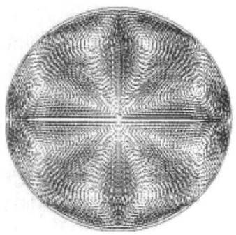 有了速度場協(xié)同方程,我們就可以尋找最優(yōu)流場的形式。下面給出兩個典型的例子。一個是圓管內(nèi)的層流換熱的最優(yōu)流場,圖1圓管內(nèi)層流對流換熱的最優(yōu)流場求解的結(jié)果是: 給定溫度邊界條件時,它是由八個渦(圖l)或者是四個渦組成的多縱向渦的流場結(jié)構(gòu)??v向渦流動結(jié)構(gòu),使得沿傳熱方向存在速度分量。與通常情況相比(流動沿管軸向,傳熱由管壁傳向管中心),速度與溫度梯度的夾角變小,按照場協(xié)同理論可知,傳熱可以得到強化。