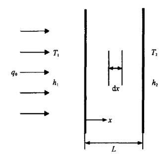 我們思考這個問題,主要是因為輻射和導(dǎo)熱是兩種不同的熱量傳遞機制。我們知道,導(dǎo)熱熱流是由局部的溫度梯度驅(qū)動的,而熱輻射是一個長程的作用過程,輻射熱流不是以局部的溫度梯度來驅(qū)動的,它取決于整個溫度場。我們針對這個問題舉一個反例。如圖1所示,冬天的窗戶玻璃,外面的太陽能 (q0) 照射在玻璃上。室外氣溫低,室內(nèi)氣溫高,太陽輻射可以從室外通過窗戶玻璃傳到室內(nèi)。我們把玻璃內(nèi)部的溫度、熱流密度、局部熵產(chǎn)率算出來,如圖2所示。發(fā)現(xiàn)計算得到的玻璃內(nèi)導(dǎo)熱熵產(chǎn)都是正的,而用傳統(tǒng)的導(dǎo)熱型輻射局部熵產(chǎn)率公式得到的輻射熵產(chǎn)是負的,綜合起的總熵產(chǎn)率也是負的。這說明傳統(tǒng)的導(dǎo)熱型輻射局部熵產(chǎn)率公式不能用來計算輻射熵產(chǎn)。