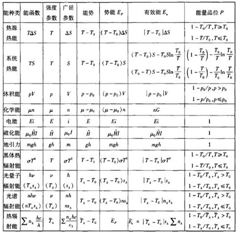 我建議: 把系統(tǒng)某形式能的有效能在由系統(tǒng)能量源與環(huán)境熱源組成的可逆做功系統(tǒng)中吸收的能量Ein中所占有的份額,定義為系統(tǒng)某形式能量的品位,建議用符號P表示,不同形式能可添加腳注區(qū)別表示。例如,T>T0的高溫熱能Eh,做功系統(tǒng)吸收的能量為Ein=Eh,有效能為Eu=(1-T0/T) Ein。,能量品位為 P=1-T0/T,與卡諾熱機效率相等,在1-0之間,這觀點普遍被接受;而當T<T0,勢能為負,低溫源的熱能Ec也有做功本領(lǐng),它通過把卡諾熱機連接于環(huán)境熱源和低溫熱源之間來實現(xiàn),卡諾熱機從環(huán)境熱源吸熱E0,輸出功W,排放到低溫源的熱能為Ec,Ec的有效能或[火用]表示為Eu=Ex=W=(1-T/T0) E0=(T0/T-1)Ec=(l-T/T0)Ein,做功系統(tǒng)吸收的能量為Ein=E0,取P=Eu/ E0=1-T/T0的無量綱量作為對應(yīng)的Ec的能量品位,范圍也在1-0之間,偏離環(huán)境溫度越低,能量的品位越高,極大值為1,符合物理規(guī)律。這樣,能量品位的度量有了統(tǒng)一了比較標準。如果取Ex/Ec=(T0/T-l) 的無量綱量表示Ec的品位,會出現(xiàn)P>1的情況,當T接近0時接近于無窮大,不合適。幾種能的能勢、勢能、有效能和能品位列于附表。由附表看出,系統(tǒng)受外力作用的能量品位都為1,所以,導(dǎo)線切割磁力線就會產(chǎn)生電能,電能、磁能、機械能是可以相互轉(zhuǎn)換的。