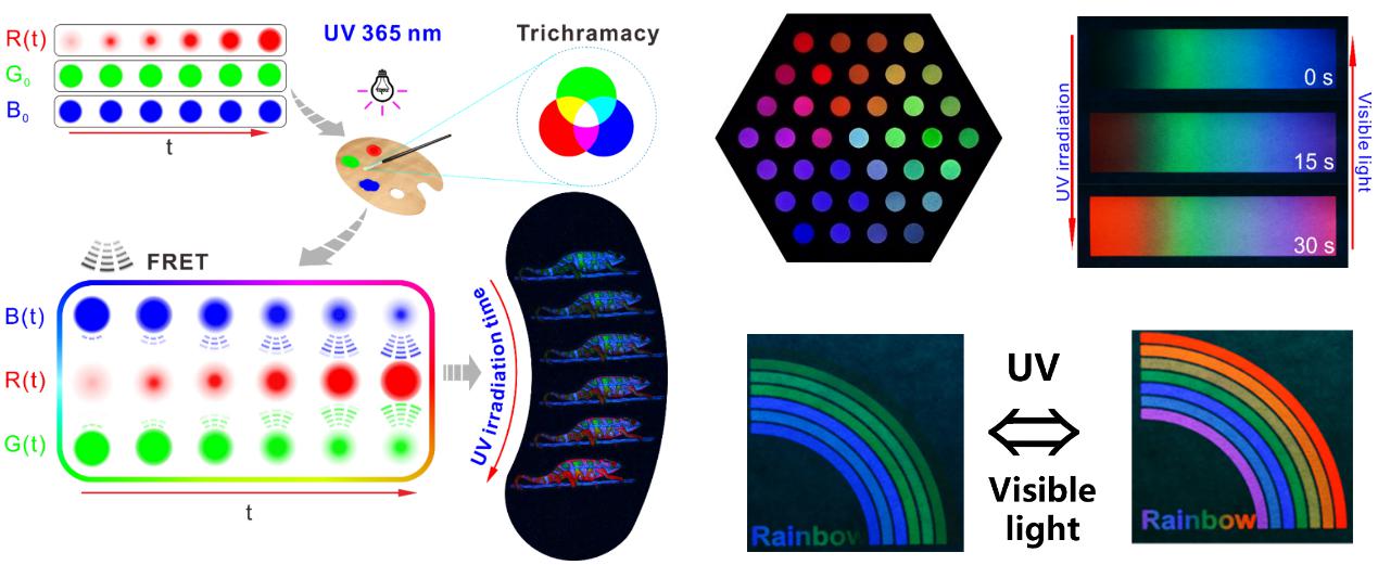 比如發(fā)光的防偽材料,利用纖維素均相可控反應(yīng)的優(yōu)勢(shì),把原來(lái)容易聚在一起的熒光分子,通過化學(xué)方法鍵合到纖維素上,克服了溶液狀態(tài)下聚集誘導(dǎo)淬滅效應(yīng),將其制成固態(tài)熒光材料,同時(shí)它仍然具有高分子的可打印、可噴涂的特點(diǎn),將不同的發(fā)光基團(tuán)接到不同的纖維素上可以得到不同的顏色,將紅、綠和藍(lán)三種顏色的纖維素衍生物共混,利用三基色原理,還可以做打印的動(dòng)態(tài)熒光材料(圖5)。